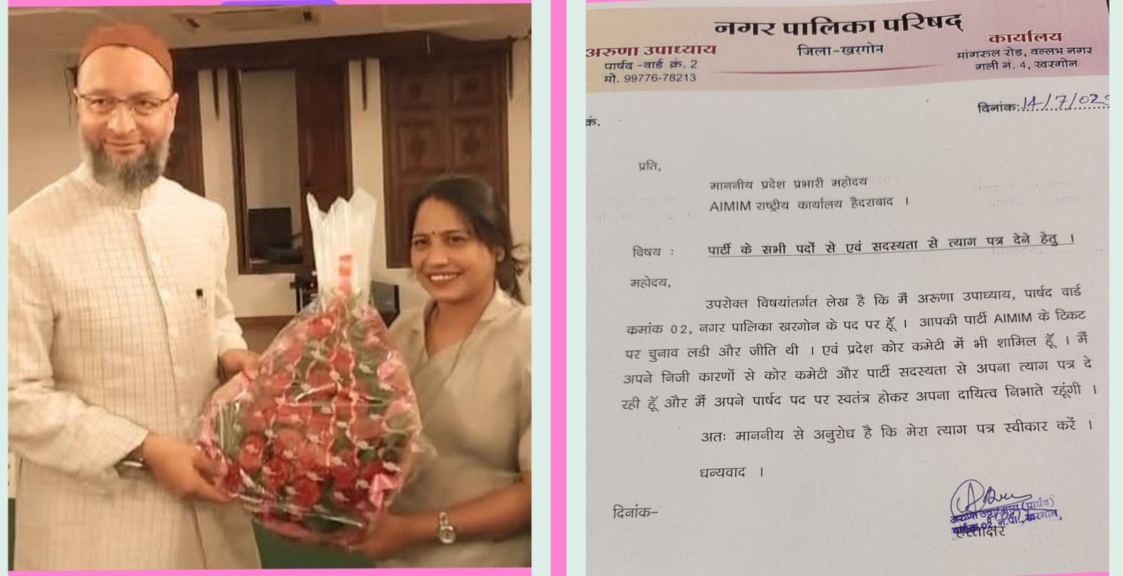 खरगोन। नगरपालिका खरगोन में महिला पार्षद अरुणा उपाध्याय ने असदुद्दीन ओवैसी की पार्टी एआईएमआईएम की प्राथमिक सदस्यता छोड़ दी है। अपने लेटर पैड पर एमआईएम के हैदराबाद के राष्ट्रीय कार्यालय को भेजें पत्र में अरुण उपाध्याय ने लिखा कि “मैं अरुणा उपाध्याय वार्ड क्रमांक-2 पार्षद नगरपालिका खरगोन के पद पर हूं। आपकी पार्टी एआईएमआईएम के टिकट पर चुनाव लड़ी थी और जीती थी। मैं अपने निजी कारणों से कोर कमेटी और पार्टी सदस्यता से अपना त्यागपत्र दे रही हूं, और मैं अपने पार्षद पद पर स्वतंत्र रूप से दायित्व निभाते रहूंगी। अतः माननीय से अनुरोध है मेरा त्यागपत्र स्वीकार करें।” उल्लेखनीय वर्ष 2022 के निकाय चुनाव में असदुद्दीन ओवैसी की पार्टी से प्रदेश में चार पार्षद जीते थे। इनमें खरगोन की अरुणा उपाध्याय भी शामिल थीं लेकिन वे एआईएमआईएम से प्रदेश की पहली हिंदू पार्षद बनकर चर्चा में रहीं। गौरतलब है वार्ड क्रमांक-2 से अरुणा के सामने भाजपा प्रत्याशी सुनीता गांगले और कांग्रेस की शिल्पा सोनी मैदान में थीं। इन सबको पछाड़ते हुए उन्होंने 643 मत प्राप्त किये थे। वहीं भाजपा उम्मीदवार सुनीता को 612, कांग्रेस की शिल्पा को 498 मत मिले थे, वह तीसरे स्थान पर रही थी। अरुणा ने 31 मतों से विजय हासिल की थी। खरगोन के वार्ड क्रमांक-2 में निकाय चुनाव के दौरान कुल 2915 मतदाता थे। वार्ड में 70% मुस्लिम आबादी होने के बावजूद भी उन्होंने जीत हासिल की थी। गौतलब है पिछले कुछ दिनों से पारिवारिक विवाद के कारण पार्षद अरुणा उपाध्याय परेशान चल रहीं थीं। उनके इस तरह पार्टी की सदस्यता छोड़ने से राजनीतिक गलियारें में चर्चा जोर पर है।