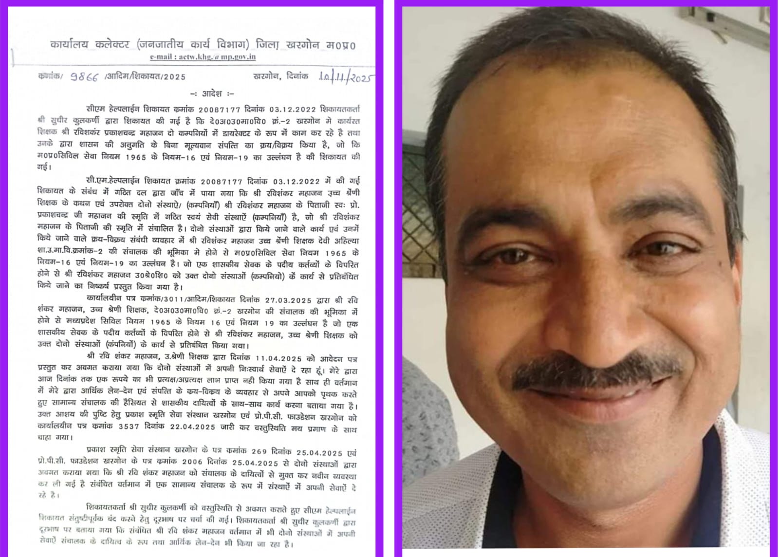 खरगोन। कलेक्टर भव्या मित्तल ने शासन की आंख में धूल झोंकने वाले और हठधर्मिता करने वाले शिक्षक रविशंकर प्रकाशचंद महाजन को तत्काल प्रभाव से निलंबित किया है। देवी अहिल्या शासकीय उच्चतर माध्यमिक विद्यालय क्रमांक- 1 में पदस्थ उच्च श्रेणी शिक्षक रविशंकर महाजन शासकीय शिक्षक होने के बावजूद दो कंपनियों में डायरेक्टर के रूप में काम कर रहे थे। महाजन का निलंबन अवधि में कार्यकाल झिरन्या बीईओ कार्यालय रहेगा।